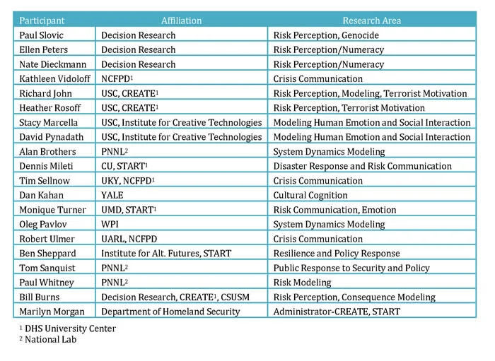This workshop was supported by the United States Department of Homeland Security through the National Center for Risk and Economic Analysis of Terrorism Events (CREATE) under grant number 2007-ST-061-000001, and the National Science Foundation under grant number SES 0728934. However, any opinions, findings, and conclusions or recommendations in this document are those of the authors and do not necessarily reflect views of the United States Department of Homeland Security or the National Science Foundation.